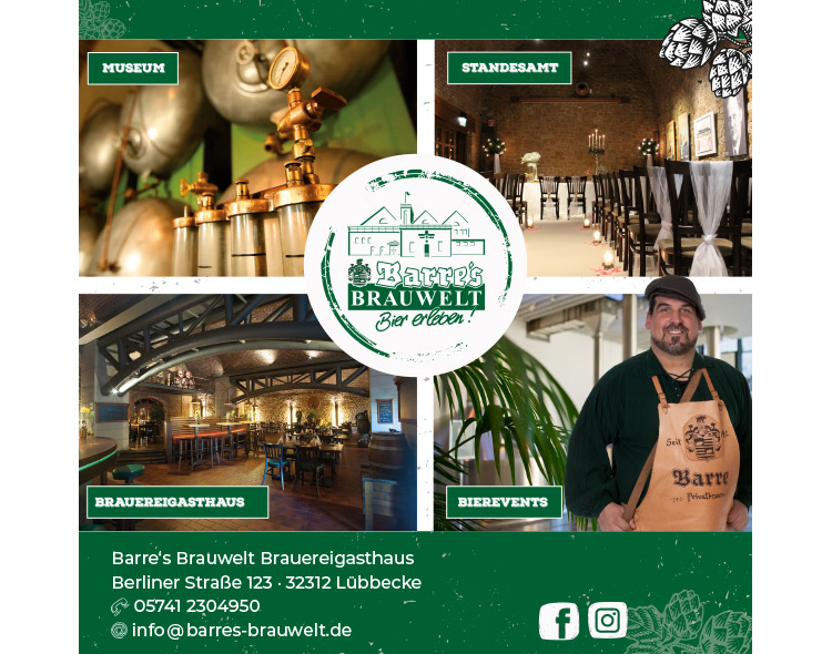 Herzlich Willkommen in Lübbecke, der Heimat der Privatbrauerei Barre. Mit einem Blick hinter die Kulissen wird deutlich mit welcher Sorgfalt & Leidenschaft die regionalen Bierspezialitäten gebraut werden. In bereits 6. Familiengeneration werden dabei innovative Entwicklungen stets mit traditionellen Werten erfolgreich vereint. Lassen Sie sich von einem echten Biersommelier begeistern und in die Geheimnisse des Bieres entführen!