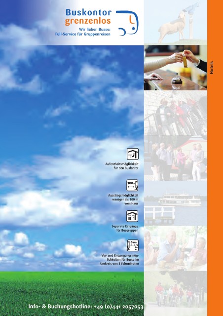 Hotels Aufenthaltsmöglichkeit für den Busfahrer Ausstiegsmöglichkeit weniger als 100 m vom Haus Separate Eingänge für Busgruppen Ver- und Entsorgungsmög- lichkeiten für Busse im Umkreis von 5 Fahrminuten Info- & Buchungshotline: +49 (0)441 2057053